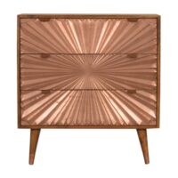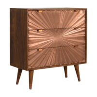 This Manila Copper Chestnut Chest was designed to add a touch of elegance and charm to your home. It features 3 copper-inlay plated drawers along with Nordic-style cap feet, it has been constructed from 100% solid mango wood and offers a rich chestnut finish, as well as pull-out, handles, and surface space on top to uplift your bedroom.