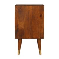 This Manila Gold Chestnut Bedside Table was designed to add a touch of elegance and charm to your bedroom. Featuring brass-plated drawers and Nordic-style brass cap feet, this piece has been constructed from 100% solid mango wood and offers a rich chestnut finish along with pull-out handles and surface space to uplift your whole bedroom look.