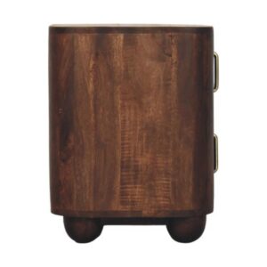 Crafted from 100% solid mango wood, the Marlowe Fluted Nightstand brings together sculptural elegance and everyday function. Its gently rounded edges and globe feet create a soft silhouette, while the vertical fluted detailing adds visual rhythm. Finished in a deep California Walnut stain, the rich tone enhances the wood’s natural texture. With two smooth-glide drawers and sleek metallic handles, this piece offers refined storage for bedside or living spaces alike.