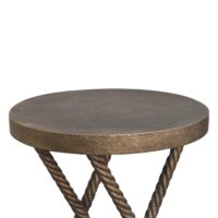 This small side table is perfect for the living room. Made from 100% solid mango wood, it’s strong and has a unique rope design on the legs. It’s finished with a shiny metallic look, adding a special touch to any space. Great for holding lamps, drinks, or decorations, it fits well with many room styles.