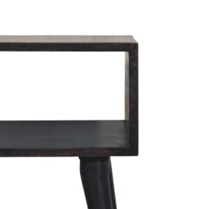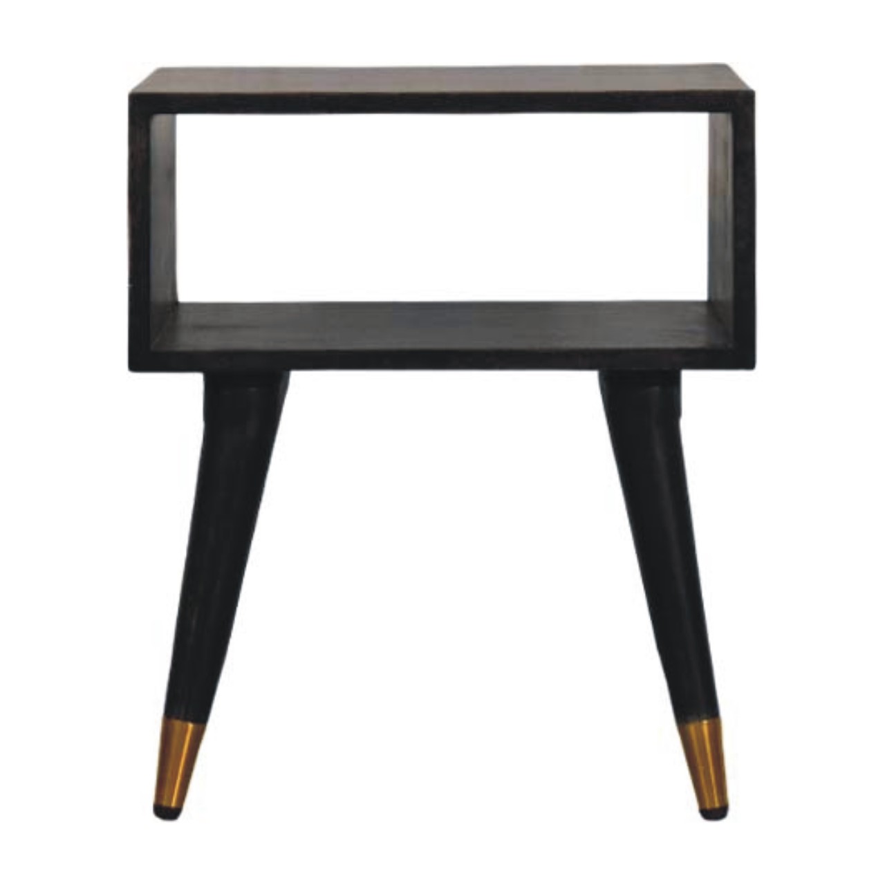 A bold silhouette meets understated sophistication in this mid-century open bedside. Crafted from solid mango wood, its airy open shelf offers effortless storage while the tapered legs with gold metal tips add a refined edge. Ideal for modern interiors, this versatile piece brings both elegance and practicality to your bedside setup.