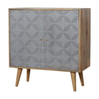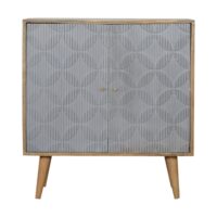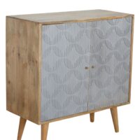 Add this lovely Cabinet to your living room or bedroom. It features a beautiful hand carved design on the door fronts and has been constructed from 100% solid mango wood in an oak-ish finish with grey hand painted door fronts. It can be used in any part of the home and can be matched well with different styles and finishes of furniture.