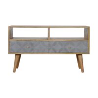 Add this lovely media unit to your living room. It features a beautiful hand carved design on the drawer front and has been constructed from 100% solid mango wood in an oak-ish finish with grey hand painted drawer fronts. It offers 2 open slots which will come in handy when storing or displaying any bits.