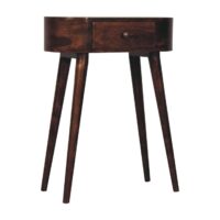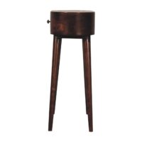 This simple bedside is constructed from 100% solid mango wood with a fine california walnut finish. It features 1 small drawer for nighttime convenience and has 4 Scandinavian style legs to modernize your home, it can also be fitted in tight compact space to go in any type of home interior. This product is part of the Recession Collection.