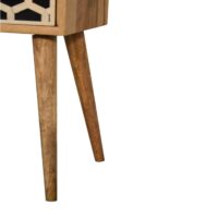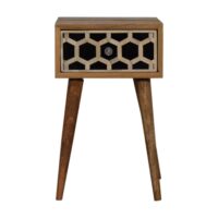 This beautifully designed bedside is constructed from 100% solid mango wood and has an oak-ish finish. Useful storage space is available with 1 bone inlay drawer, as well as a decent-sized tabletop to display ornaments. Other features include 4 Nordic-style legs. This is a modern style which will suit most homes.