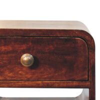 The mini version of our famous IN308, this small but handy bedside makes a perfect stand for nibbles, drinks, or a lamp. It will prove handy all over your home and is made from 100% solid mango wood in a fine california walnut finish. It has curved edges which will fit into any home/living space. It also comes with 1 drawer, 1 lower open slot and 4 Nordic style legs. This petite product is part of Recession Collection.