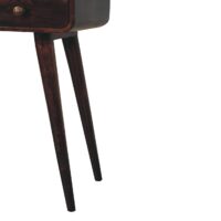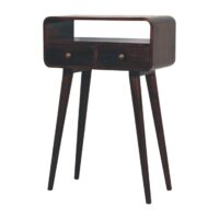 The mini version of our popular IN311, this simple, elegant console table has beautifully curved edges to fit perfectly in any living space, it features two drawers and 1 open slot to help you keep your home and has shiny knobs with a california walnut finish and 4 Nordic style legs. This petite product is a part of Recession Collection.