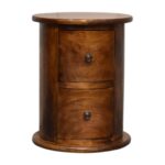 This cute mini round 2-drawer country-style drum chest is made from 100% solid mango wood and has a fine chestnut finish with shiny knobs on the drawers. The piece is perfect for storing small items like keys, and loose change and has space on top for displaying photos, ornaments, and collectibles. This product can be used as either a bedside table, an end table, or an occasional table. This petite product is a part of Recession Collection.