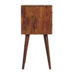 This beautifully designed bedside is constructed from 100% solid mango wood and has a fine chestnut finish. It features 2 small cube-carved drawers giving the piece extra character and dimension. It has 4 Scandinavian-style legs to modernize your home and can be fitted in tight compact spaces to go in any type of home interior. This petite product is a part of Recession Collection.