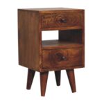 Obtain an effortless look with our Mini Classic Oak-ish Bedside. It is constructed from 100% solid mango wood and the sleek design is complemented by shiny brass knobs and nordic style legs as well as 2 drawers and an open slot. The perfect piece to use alone or pair with different styles and finishes of furniture. This petite product is part of Recession Collection.