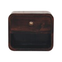Inspired by our curved range, this minimalistic mini wall-mounted unit has been constructed from 100% solid mango wood in a california walnut finish and features 1 drawer and 1 open slot. This piece is perfect for storing any bits and pieces you wish to keep close by before bedtime. Its neat and clean design can easily be mounted on the wall without the fuss of any legs. Caution! Do not sit on the unit.