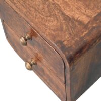 Inspired by our curved range, this minimalistic mini wall-mounted unit has been constructed from 100% solid mango wood in a california walnut finish and features 2 drawers that feature shiny knobs. This piece is perfect for storing any bits and pieces you wish to keep close by before bedtime. Its neat and clean design can easily be mounted on the wall without the fuss of any legs. Caution! Do not sit on the unit.