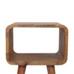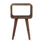 This mini bedside table features a very simplistic and clean design. It has 4 tapered legs, and an oak-ish body constructed from 100% solid mango wood. Being a simple piece it features one open compartment for placing any bits and pieces before bed and ample space on top for a lamp, photo frames, or ornaments. Its plain design means it can be matched perfectly with any style of furniture or interior. This petite product is part of Recession Collection.