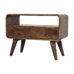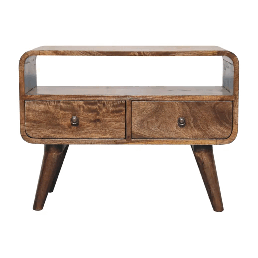 Our mini solid timber media unit is expertly constructed from 100% solid mango wood in a lovely grey-washed finish. Some features include 2 drawers that come with a shiny knob, a large open slot to place any books, photo frames, ornaments, and 4 Nordic-style legs. This petite product is a part of Recession Collection.