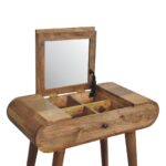 Add this mini dressing table to your bedroom. Constructed from 100% solid mango wood in an oak-ish finish with 1 drawer it features Nordic-style legs, a foldable mirror, and storage compartments for storing any bits and pieces such as jewelry and makeup. This is a lovely and versatile piece that will complement any room beautifully. This petite product is a part of Recession Collection.