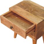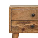 Endlessly versatile, this mini bedside table makes a perfect stand for nibbles, drinks, or a lamp and will prove handy all over your home. It is made from 100% solid mango wood in a oak-ish finish and features 2 drawers. Other features include shiny knobs on the drawers and 4 Nordic-style legs.