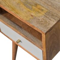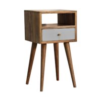 This beautiful and neat bedside is constructed from 100% solid mango wood and has a fine oak-ish finish. Useful storage space is available with 1 sky blue hand-painted drawer, 1 shelf, and a decent-sized tabletop to place any ornaments. Other features include 4 Scandinavian-styled legs.