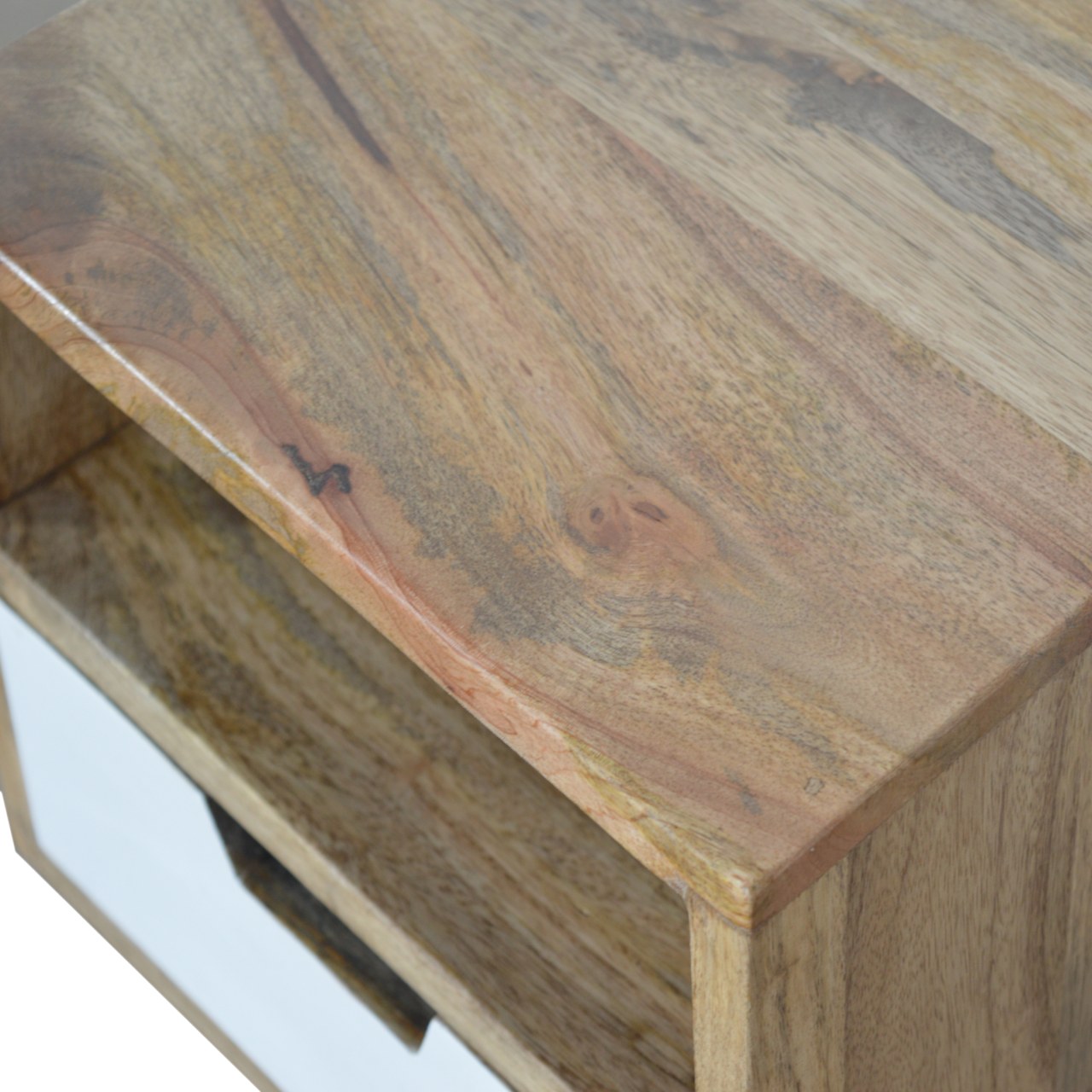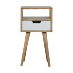 This beautifully designed bedside is constructed from 100% solid mango wood and has a fine oak-ish finish. Useful storage space is available with a 1 white hand painted drawer, 1 shelf and a decent sized table top to place any ornaments. Other features include 4 Scandinavian styled legs to give the piece a modern style which will suit most interiors.