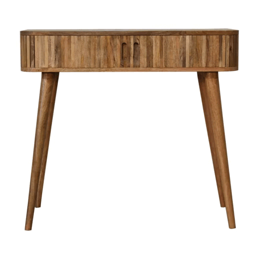 Our Mokka Console Table will create an opulent ambience in your living room or hallway. Constructed from 100% solid mango wood it features a distinctive elegant mixed wood pattern, as well as featuring 2 cut-out handles and 4 nordic style legs. A simple but effective piece for the home.