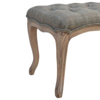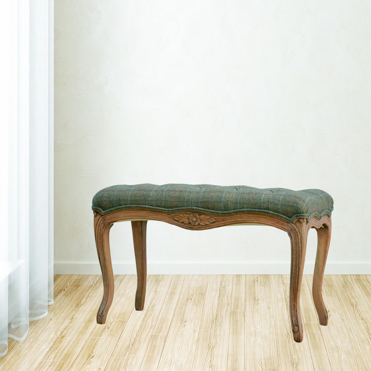 This hand carved bedroom bench has has been exquisitely upholstered in 100% multi tweed and constructed in 100% solid mango wood which has a fine sun bleached finish. Carved from the finest timbers and boasting both intricate carved details, antique brass studs and 4 classical French style cabriole legs, this piece encompasses traditional elegance and can bring a vintage fashion into your bedroom that subtly blends with any interior. You may encounter variations from batch to batch hence if you are looking to pair products under similar room settings; you can opt for a bespoke order or take an informed decision about the possible variations.