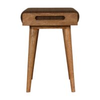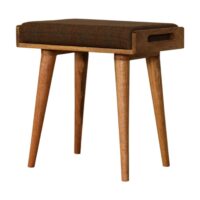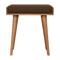 This footstool features a tray-style design and 4 Nordic-style legs constructed from 100% solid mango wood. It has an upholstered multi tweed top that works as a comfortable seat and can be incorporated into many different interior styles as it offers a very clean and modern design, along with providing a nice contrast between the material and wood.