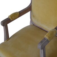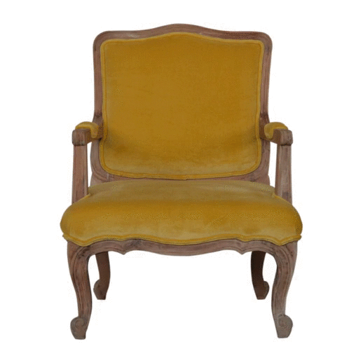 This elegant chair has been upholstered in a mustard yellow cotton velvet fabric. It features carved French style cabriole legs constructed from 100% solid mango wood in a sunbleach finish providing strength and durability. This simple yet classy piece can be incorporated in different home settings and interiors.