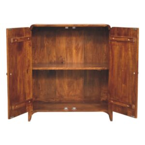 Blending vintage elegance with practical storage, this cabinet is handcrafted from 100% Solid Mango Wood in a rich chestnut finish. Its gracefully curved design adds a refined touch, while the double-door storage, adorned with royal brass knobs, opens to reveal ample shelving for organizing essentials while maintaining a clean and sophisticated aesthetic. Perfect for living rooms, hallways, or bedrooms, this sustainably crafted piece combines timeless craftsmanship with everyday functionality, making it a charming and durable addition to your home.