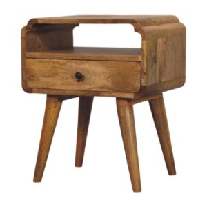 With its elegant curves and timeless craftsmanship, this bedside table is handcrafted from 100% Solid Mango Wood in oak-ish finish. Designed for both style and functionality, it features a single drawer with a royal brass knob for discreet storage and an open shelf for easy access to books or essentials. Resting on sleek, tapered legs, this piece brings a refined mid-century charm to any bedroom or living space. Durable, sustainable, and effortlessly stylish, it seamlessly blends practicality with artisanal beauty, making it a standout addition to your home.