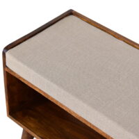 This Nordic style shoe storage bench has been beautifully made from 100% solid mango wood in a chestnut finish. This bench provides comfortability with a seat pad upholstered from mud linen and can be used in a variety of settings such as the bedroom, hallway or living room.