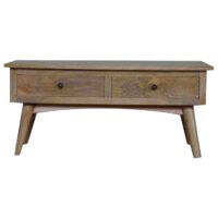 A traditional solid wooden coffee table with two drawers all drawers come with handmade dovetail joints for added strength. The solid wood coffee table has an appealing rusticity and solid design with a fine oak-ish finish. The no fuss finish reveals the beautiful grain of the fruit-wood mango wood which this piece of furniture is made of. Made from solid hard wood this has been built to last and offers storage with two drawers.
