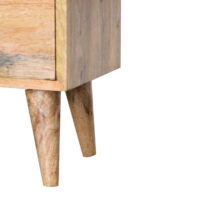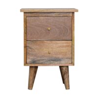 This bedside table has been constructed from 100% solid mango wood with Nordic style legs in a oak-ish finish and features shiny knobs on the 2 drawers for easy access. An easy, simple, and versatile piece to add to any type of bedroom.