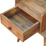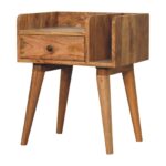 This contemporary bedside has storage available with the space of an open slot and a small drawer, as well as plenty of space on top to keep belongings close before bedtime for your convenience. Other features include nordic style legs and a shiny brass knob.