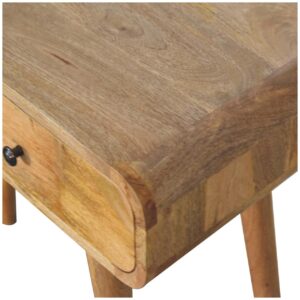This simple, elegant console table has beautifully curved edges to fit perfectly in any living space, this 100% solid mango wood unit has been built with sustainably sourced timbers and has two drawers to help you keep your home organized by storing away any little household objects. It has shiny knobs and has a fine oak-ish finish with 4 Nordic style legs.
