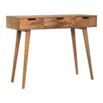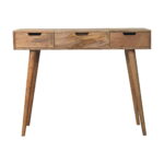Add this beautiful dressing table to your home. Constructed from 100% solid mango wood in an oak-ish finish with 3 spacious drawers, it features a foldable mirror and storage compartments for storing any bits and pieces. Other product features – include Nordic style legs and cut-out slots for easy access to and from the drawers. A lovely versatile piece that will complement any room beautifully.