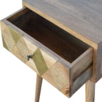 Endlessly versatile, this bedside table has a beautiful golden brass insert on the drawer front with 4 Scandinavian style legs which have golden plating on the legs for extra detail. It makes a perfect stand for nibbles, drinks or a lamp. It will prove handy all over your home and is made from 100% solid mango wood with a fine oak-ish finish. Every piece of furniture is individually handcrafted and includes swing care tickets explaining the cautions and aftercare instructions.