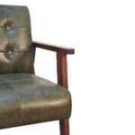 This contemporary armchair is certain to add a sophisticated look & lavish living room or dining room experience. Made from quality buffalo hide leather it is upholstered in a rich olive green colour with a plump seat, and a deep button back cushion. The legs and arms are constructed from 100% solid mango wood in a walnut finish. We hope you love it as much as we do.