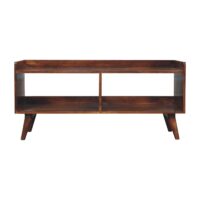 Introducing our Open Top Chestnut Media Unit, crafted from 100% solid mango wood in a chestnut finish. With its clean, modern design featuring Nordic-style legs, it adds contemporary charm to any space. This versatile piece includes a top shelf for displaying décor or holding glasses, along with an open space below for convenient storage. Elevate your home with the practical elegance of this console table today.