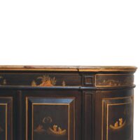Embrace the essence of Peking art with the Oriental Elegance Bedside Table. Crafted from solid mango wood, this table features a hand-painted black base adorned with hand sketched oriental characters, each telling a unique story. The design is highlighted by a serpentine-style plinth bottom, adding an elegant flow. A shiny brass knob complements the piece, ensuring functionality meets style. This bedside table is a perfect blend of durability, artistic charm, and Chinese cultural influence.