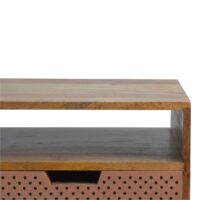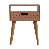 This bedside table has been constructed from 100% solid mango wood and features 1 perforated drawer front in a copper finish which compliments the oak-ish body perfectly. It stands on 4 Nordic style legs and has 1 drawer and an open cut out slot. It can be partnered with the other pieces from the the copper front collection or stand alone as an accent piece in the bedroom.