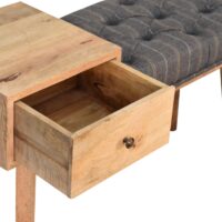 This telephone table bench is a practical piece of furniture for the hallway as well as the living room. It is constructed from 100% solid mango wood which has a fine oak-ish finish and upholstered in pewter tweed. Other features include 1 deep drawer that comes with a shiny brass knob, and 4 Scandinavian styled legs. You may encounter variations from batch to batch hence if you are looking to pair products under similar room settings; you can opt for a bespoke order or take an informed decision about the possible variations.