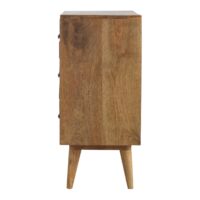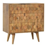 This multi-utility chest of drawers has been constructed from 100% solid mango wood and has a fine oak-ish finish. Its unique design offers useful storage space with 3 large spacious drawers to take care of everyday utility items. It features shiny knobs, 4 Nordic style feet, and mainly the beautiful pineapple hand carved design on the drawers giving the product a unique look. It will add a definite and lasting character to any home space or living room.