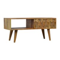 IN657 – This media unit has been constructed from 100% solid mango in an oak-ish finish. It stands on 4 Nordic-style legs making it strong and sturdy. Some other features include an open slot with 1 sliding door with a pineapple-carved door front design. It can look great alone or be partnered with the other pieces from the pineapple carved range.
