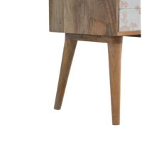 This bedside table is a versatile piece that will prove handy all over your home and provide storage for any bits and pieces before bed. It has been made from 100% solid mango wood with has a fine oak-ish finish. It also comes with 2 pink floral screen printed drawers that have glass knobs and 4 Nordic-style legs.