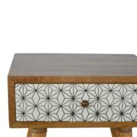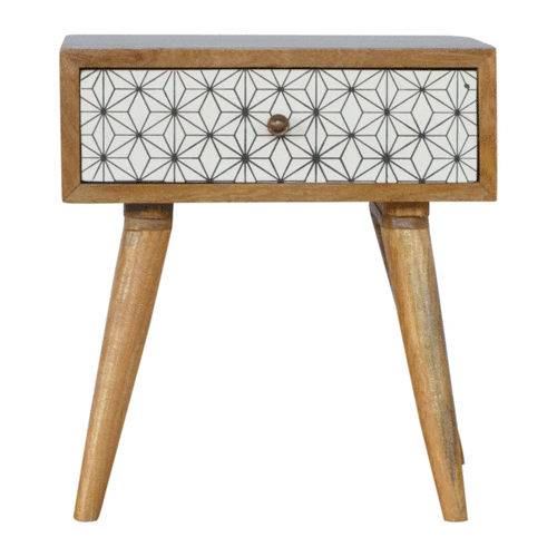 This bedside table is the perfect addition to add to any bedroom. It will prove handy all over your home and is made from 100% solid mango wood with a fine oak-ish finish. It also comes with a geometric screen printed drawer that has a shiny knob and has 4 Nordic style legs.