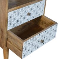 This 2 drawer bedside has been constructed from 100% solid mango wood and finished in a fine oak-ish finish. The main features of this piece are the 2 screen printed drawer fronts which have a beautiful black and white geometric design giving the piece extra dimension and character. Useful storage is provided with the open slot allowing you to keep any bits and pieces close before bedtime. It also has 4 Nordic style legs, knobs and ample space on top for a lamp, photo frames, or ornaments.