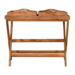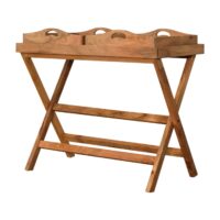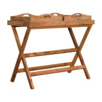 This practical and timeless butler style tray table, combines both a modern and classic style for everyday use throughout the home. The piece has been constructed from 100% solid mango wood in an oak-ish finish and features practical foldable legs. It also features a geometric screen printed design and cut outs for your convenience. The folding mechanism requires the tray to be removed prior to de-assembling of the base.