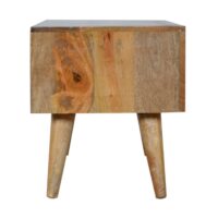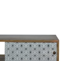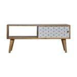 This solid wood coffee table features 1 open slot and 1 geometric screen-printed door front giving the piece extra dimension and character. Constructed from solid Mango wood in an Oak ish finish this piece has been built to last offer enough storage for bits like books and magazines. It features 4 Nordic style legs which complement the body nicely and gives the entire piece a contemporary look. The perfect addition to the home.