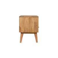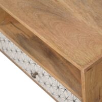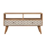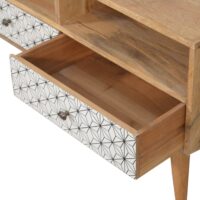 This 2 drawer media unit has been constructed from 100% solid mango wood and finished in a fine oak-ish finish body. The main feature of this piece is the screen-printed drawer fronts which each have a beautiful black and white geometric design. Useful storage is provided with open slots and drawers that can be used to store any CDs, films, or books. It also features 4 Nordic-style legs and shiny knobs.
