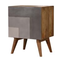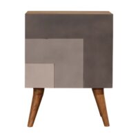 Offering a clean and sharp L pattern and hand painted in 3 rich shades of grey this bedside offers plenty of room on top for a lamp, photo frame or books. Storage is offered with one door which can be used to easily store bits and pieces and keep them close and handy before bedtime. Other features incude nordic style legs and the body is constucted from 100% solid mango wood.