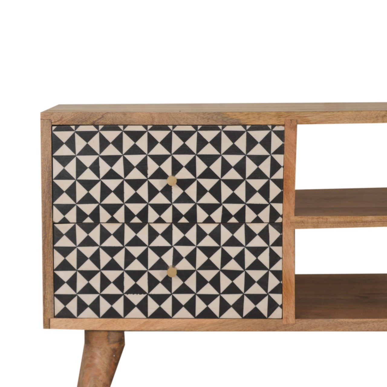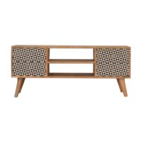 As part of our Rafina range, this media unit has been constructed from 100% solid mango wood in an oak-ish finish. It has 2 drawers and 2 open slots for storage convenience and features nordic style legs with shiny knobs which give a lovely contrast against the print. More items are available from the Rafina range.